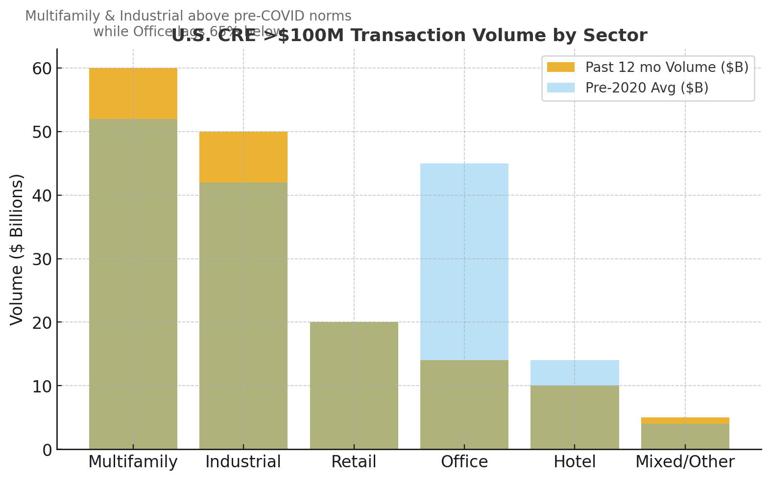 Office sales >$100 M totaled just $14 B (-65% vs. pre-2020 average $40–50 B).