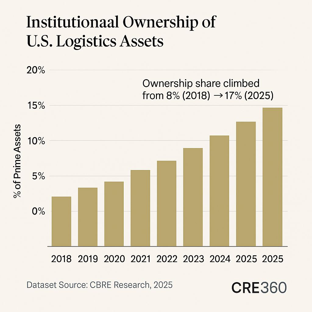 🚨Financial firms have emerged as dominant players in U.S. industrial real estate, now owning roughly 17% of prime logistics assets — a sharp rise fueled by ~$88 billion in Q1 2025 acquisitions. Using hybrid debt-equity models and joint ventures with 3PLs, institutions have effectively industrialized ownership itself. With cap rates compressing to ~5.2%, the sector is behaving more like fixed income than traditional real estate. For CRE operators, this means valuations are increasingly driven by institutional balance sheets and capital markets dynamics, not just rent growth or construction cycles.