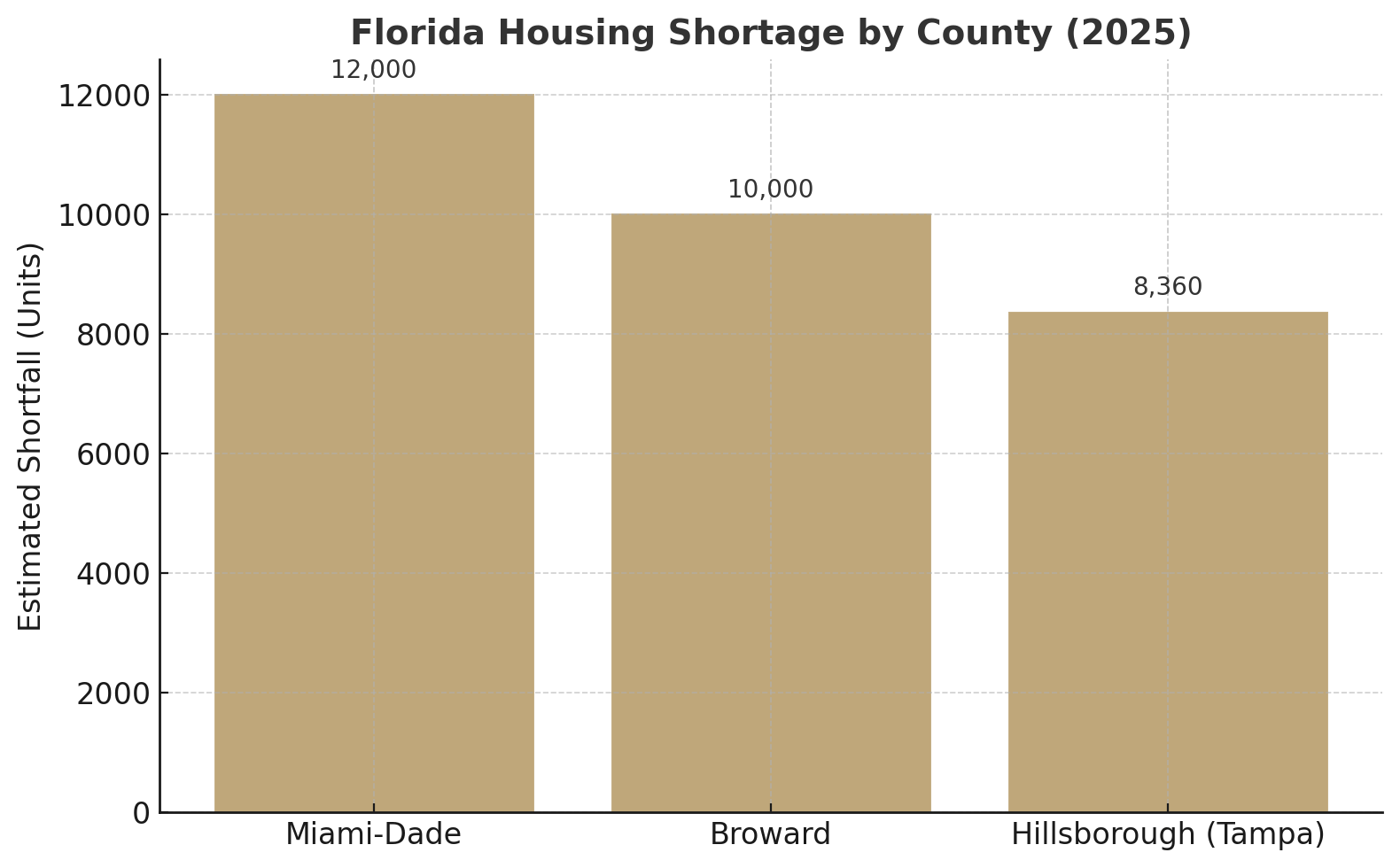Florida faces a ~120 000-unit housing shortfall, led by Miami-Dade (12 k) and Broward (10 k +).