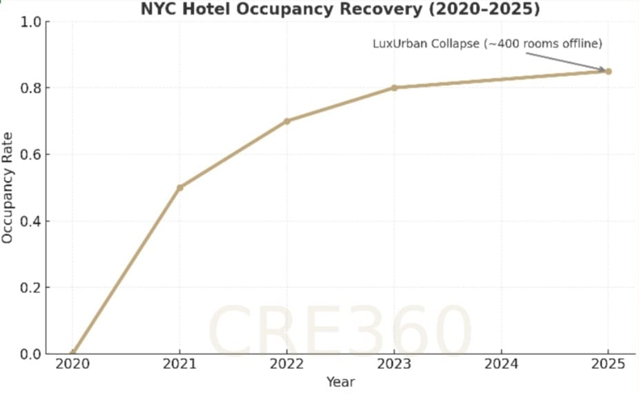 By contrast, NYC hotel occupancy sits near 85%, the highest since 2019, showing sector strength even as one operator implodes.