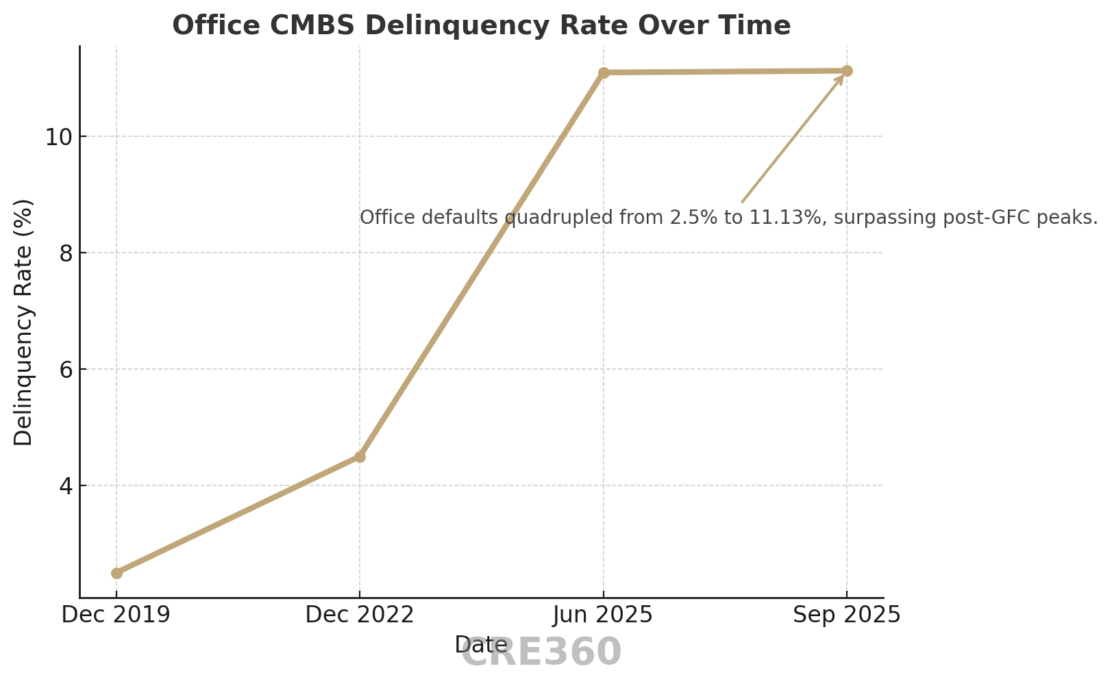 The office market’s credit crisis has entered a new phase. Delinquencies at 11.13 % — nearly quadruple 2019 levels — confirm that even major owners can’t refinance at today’s values. With tenancy fragile and capital scarce, the sector faces a systemic repricing of risk and asset value rather than a temporary cycle. Refinancing has become triage.