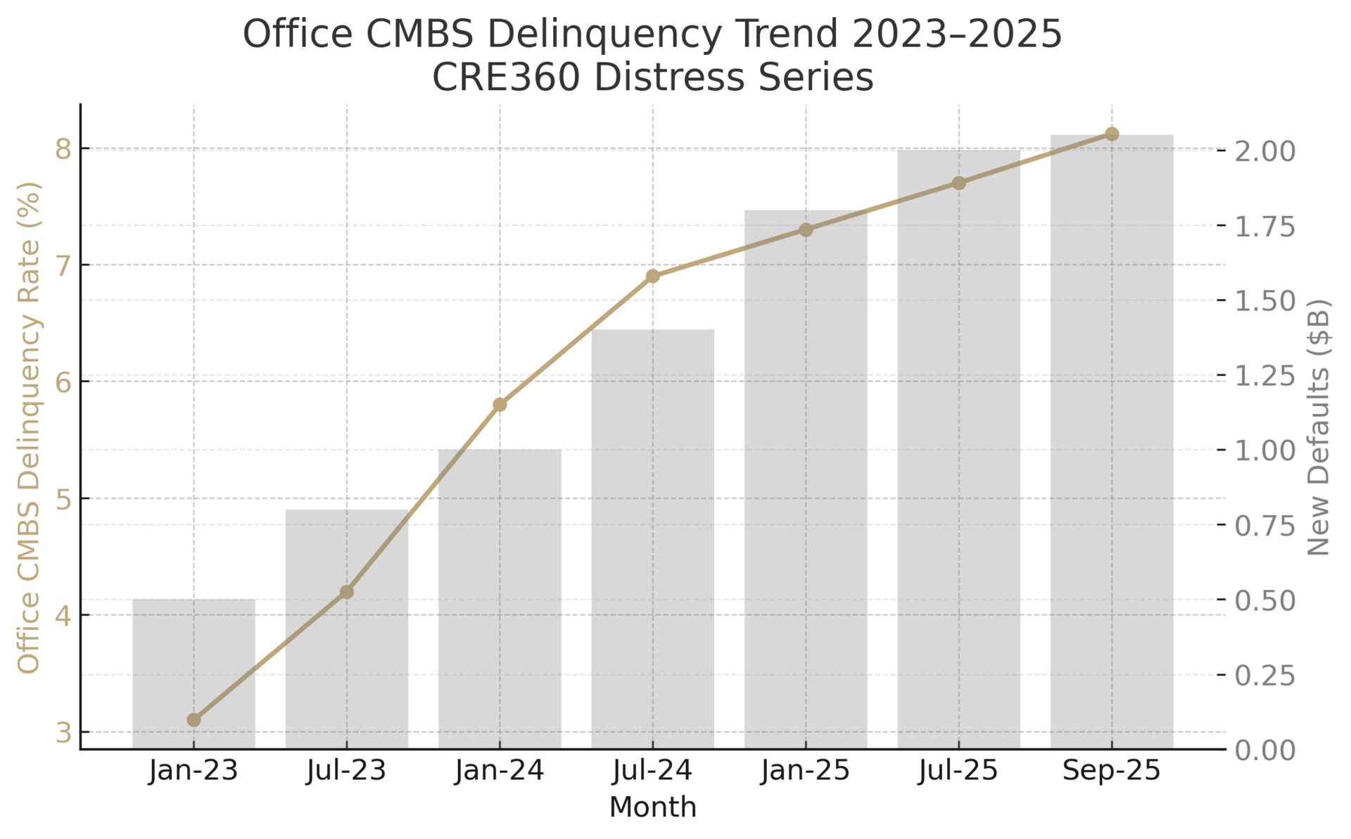 September’s 8.12% office delinquency rate (60+ days past due) marks a structural break in the “extend-and-pretend” era. A $180 million maturity default at 261 Fifth Avenue in Manhattan pushed the figure up 42 bps month-over-month, signaling that lenders are finally calling time on unrefinanceable loans. For the first time in two years, office defaults now dominate new CMBS distress volumes ($1.05 billion of $2.05 billion total). What was once a slow bleed is becoming a credit event.