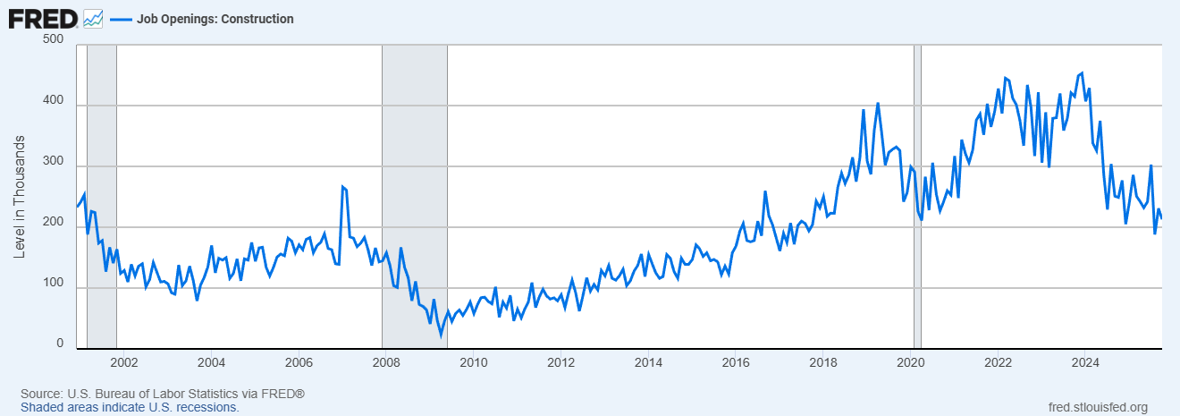 Construction job openings have declined from recent peaks; however, this reduction has not translated into a commensurate increase in labor availability.