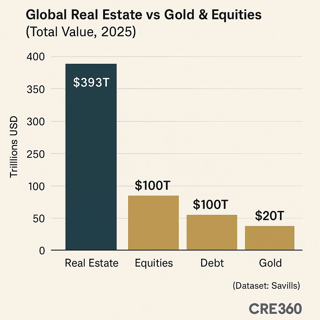 🚨Global real estate has reached a staggering $393.3 trillion valuation in 2025, underscoring its role as the planet’s dominant wealth reservoir. Despite a minor 0.5% pullback in 2024 — largely from China’s housing slump — the sector’s aggregate value now exceeds global equities and debt combined. For capital allocators, this means even marginal valuation shifts (±50 bps in cap rates) can reprice trillions in stored wealth — far beyond the scale of equity market swings.