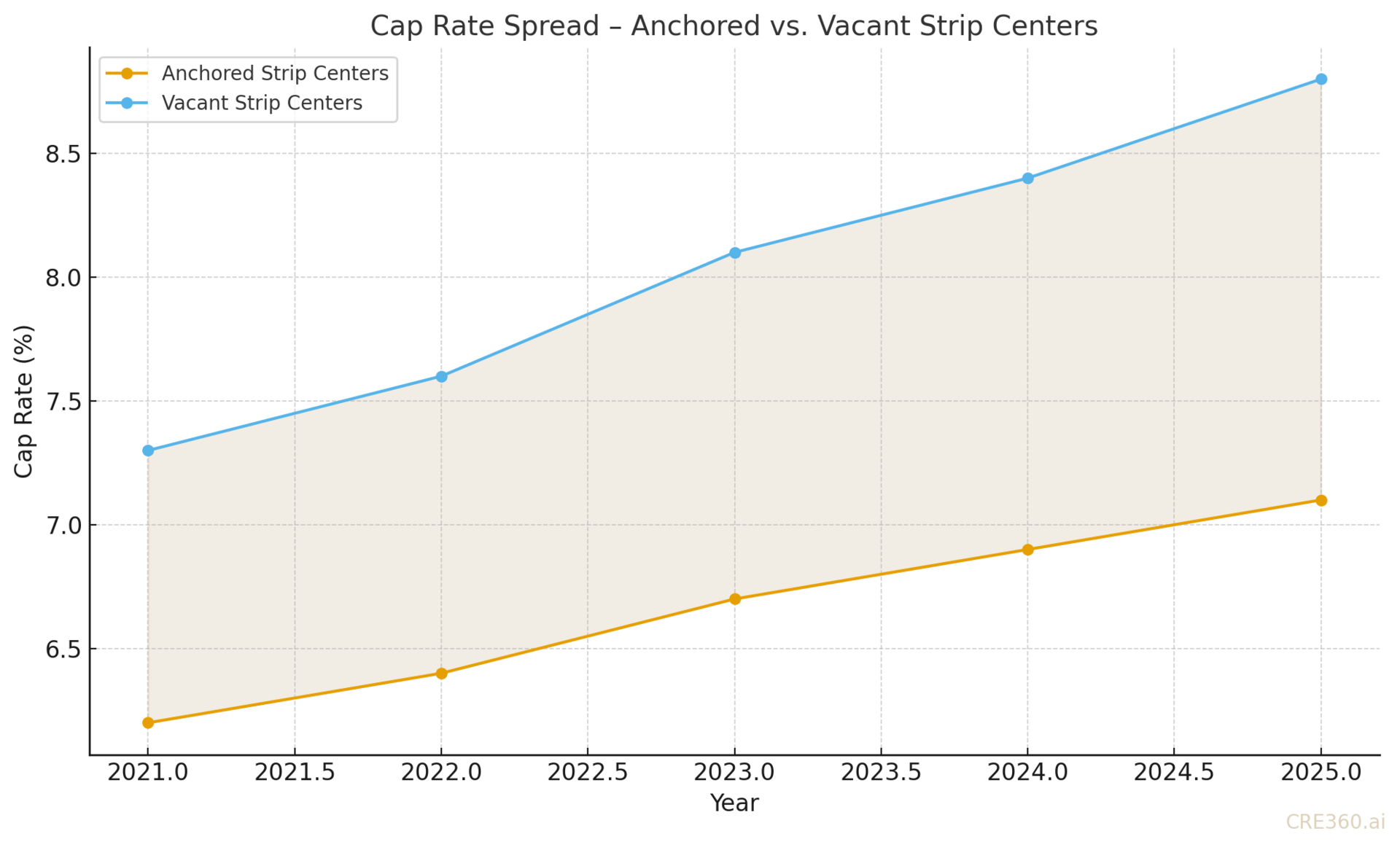 Cap Rate Spread: Anchored strips at 7.1% vs. 8.8% for vacant strips in 2025 — [Source: CBRE; Green Street].