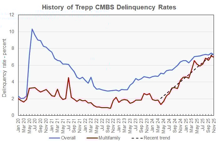 Trepp: Overall CMBS delinquency rate edges down 20 bps to 7.26%.