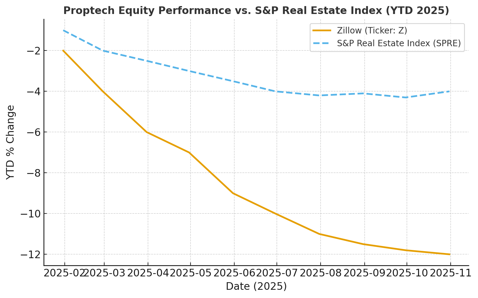 Capital Markets. Tech-adjacent CRE equities (Z, CSGP, OPEN) are underperforming the S&P Real Estate Index by ≈ –8 pps YTD. If FTC or CoStar suits tighten data monopolies, valuations could shift toward firms emphasizing verified inventory over lead-gen margin.